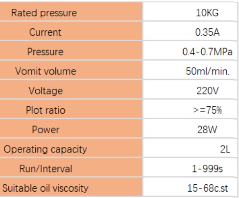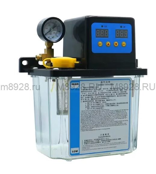 Описание Автоматический смазочный насос 2 литра 220вМаслостанция электрическая для автоматической консистентной смазки маслом узлов и деталей станка или пресса. Применяется для системы автоматической смазки станочного оборудования. Автоматическая масляный насос(помпа) оснащен таймером и резервуаром на 2 л,. Подходит для подачи полужидкой и консистентной смазки вязкостью 00 и 000. Управляется реле времени, параметры задаются на кнопками и отображаются на 2 табло. На левом задается время работы помпы при каждом срабатывании(в секундах), на втором - промежуток между включениями помпы(в минутах). Питание помпы - 1 фаза 220 В, провод без вилки.