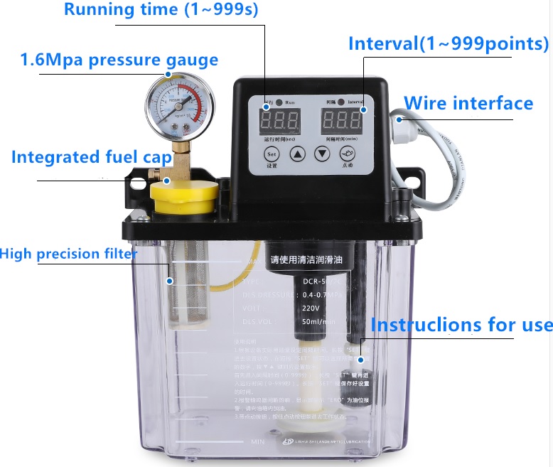 1. Установите интервал времени и времени работы в соответствии с фактическим маслом Потребление оборудования. Нажмите кнопку «SET», чтобы войти в Настройка состояния, затем нажмите кнопку «SET», чтобы выбрать номер Установите, нажмите ▲▼, чтобы увеличить или уменьшить Требуемое время. Сначала введите Время интервала (0 ~ 999 минут), рекомендуется более 10 минут. Затем нажмите кнопку «SET», чтобы войти Время работы (0 ~ 999 секунд), в течение 120 секунд рекомендуется. Наконец, Нажмите кнопку «SET», чтобы сохранить время установки. 2. Сигнал тревоги колеблется периодически, и экран дисплея показывает "ERO" для сигнализации уровня масла. Пожалуйста, заполните масляный бак. 3. С помощью кнопки «инчинг» нажмите и удерживайте кнопку «инчинг», чтобы войти в рабочий режим Состояние. 4. Используйте только новое смазочное масло, отработанное строго запрещено. Если это не используется в соответствии с правилами, масляный насос будет поврежден. Упаковочный лист: 1) масляный насос 2л 1шт Отзывы о Автоматический смазочный насос 2 литра 220вОтзывов пока не было. Вы можете оставить его первым